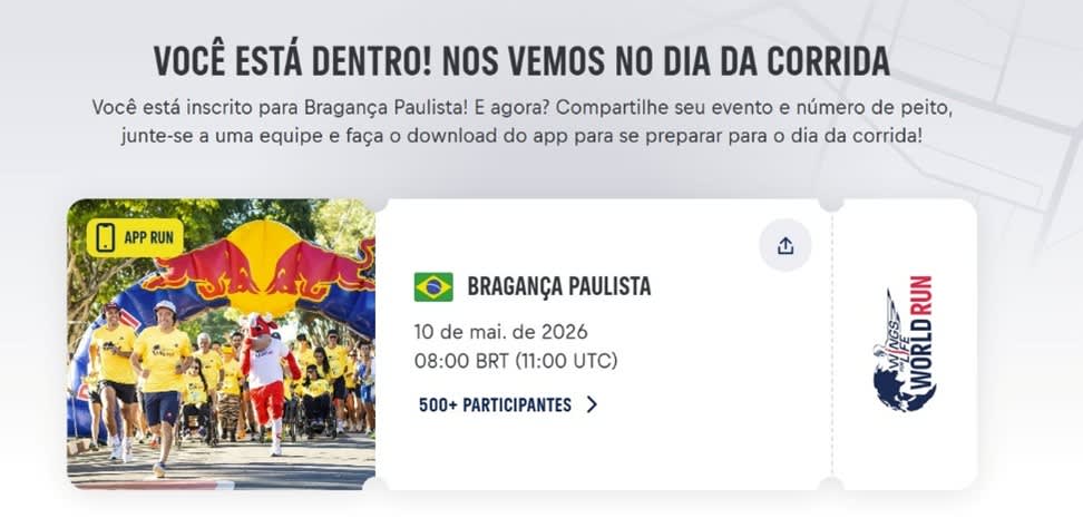 Inscrições para este evento no link: https://www.wingsforlifeworldrun.com/pt-br/locations/braganca-paulista